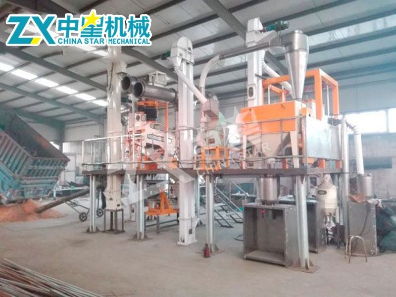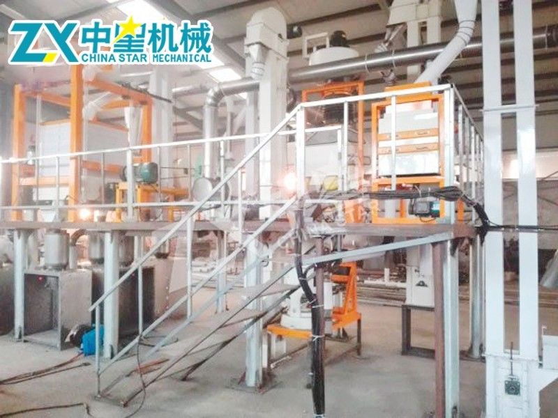 將原糧倒入單聯升運機進料斗內,經ZX19/8D單聯升運機提送到ZX-50型清理去石組合機,清理出原料中的大小雜質及并肩石。凈糧流入ZX-280G型脫皮拋光組合機升運機進料斗內,由該組合機升運機提送至ZX-280G型脫皮拋光組合機進行脫皮拋光,脫皮拋光后的原糧仁粒流入ZX-404型四分離精糝機升運機進料斗內,由該機升運機提送至ZX-404型四分離精糝機粉碎。粉碎后的糝、粉由圓筒分級篩分出大糝、中糝、小糝及粉后即可打包。皮糠由抽風機抽入離心式螺旋除塵器收集。