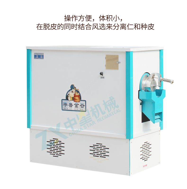 此機器操作方便,體積小,在脫皮的同時結(jié)合風(fēng)選來分離仁和種皮,從而大大降低了破碎率,更有效的提高脫皮質(zhì)量和產(chǎn)量。