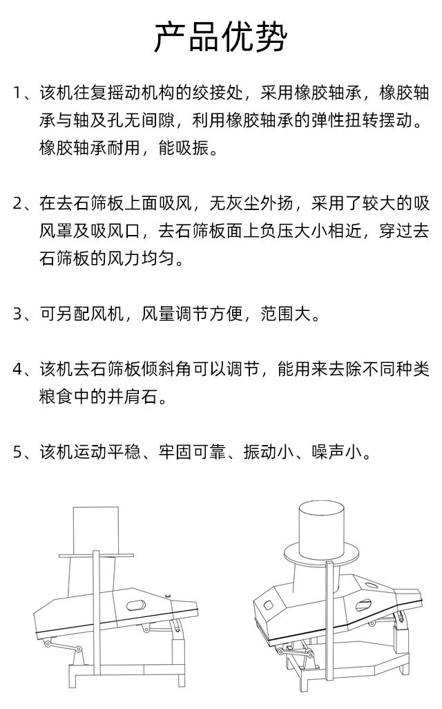 4、該機去石篩板傾斜角可以調節(jié),能用來去除不同種類糧食中的并肩石。