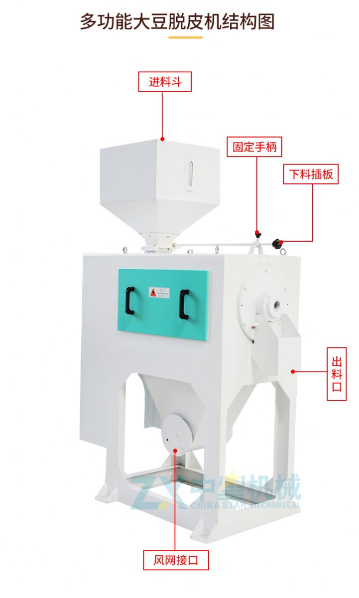 大豆(豌豆、綠豆、豇豆、蕓豆等)由進(jìn)料斗經(jīng)流量調(diào)節(jié)機(jī)構(gòu)進(jìn)人碾白室后,被螺旋頭送到砂輥并沿砂輥表面螺旋前進(jìn),按線速旋轉(zhuǎn)的金剛砂砂輥表面銳利的沙粒,碾削皮層,并使米粒與米粒、米粒和米篩相互摩擦,使其開糙及碾白,同時(shí),主軸雙向進(jìn)風(fēng)輔以吸糠風(fēng)網(wǎng),迫使糠粉脫離豆仁和脫皮工作室,排出篩孔。
